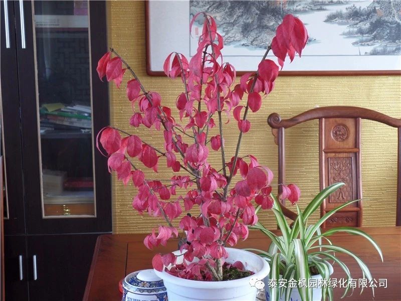 火焰衛(wèi)矛:為栽培種,落葉小灌木。株高1.5-3米。葉片夏季為深綠色,秋季變?yōu)榧t色火焰。樹枝多,長勢齊,形豐滿,易管理,耐修剪,適應(yīng)性強(qiáng),非常適合做彩色樹籬。衛(wèi)矛枝翅奇特,秋葉紅艷耀目,果裂亦紅,甚為美觀,堪稱觀賞佳木。落葉后,枝翅如箭羽,宿存蒴果裂后亦紅,冬態(tài)也頗具欣賞價值。